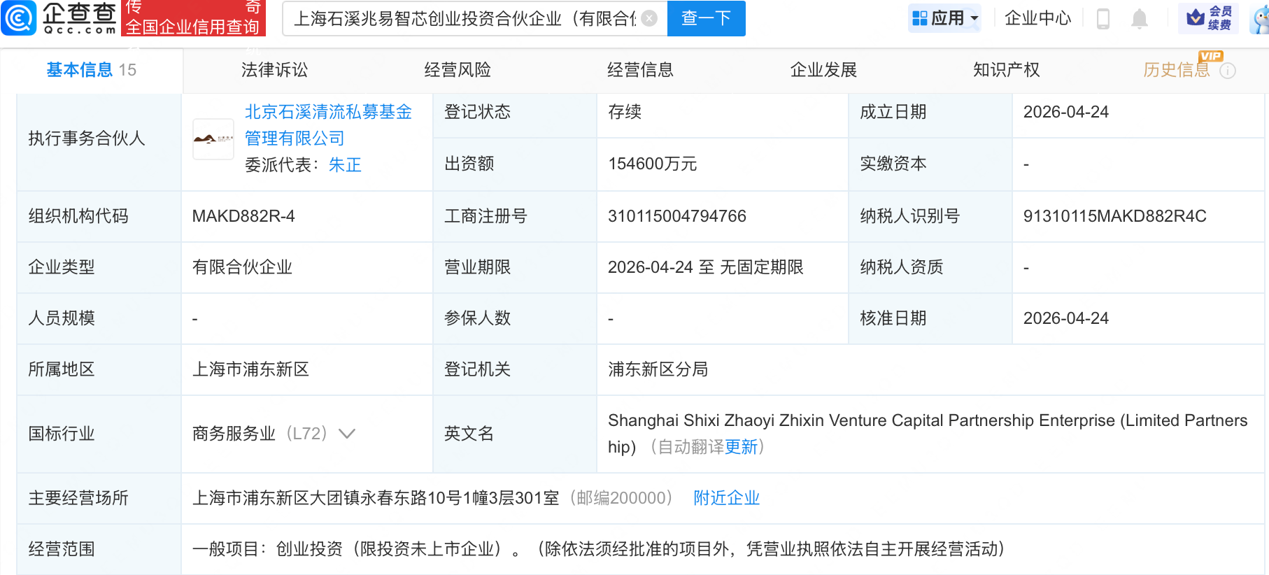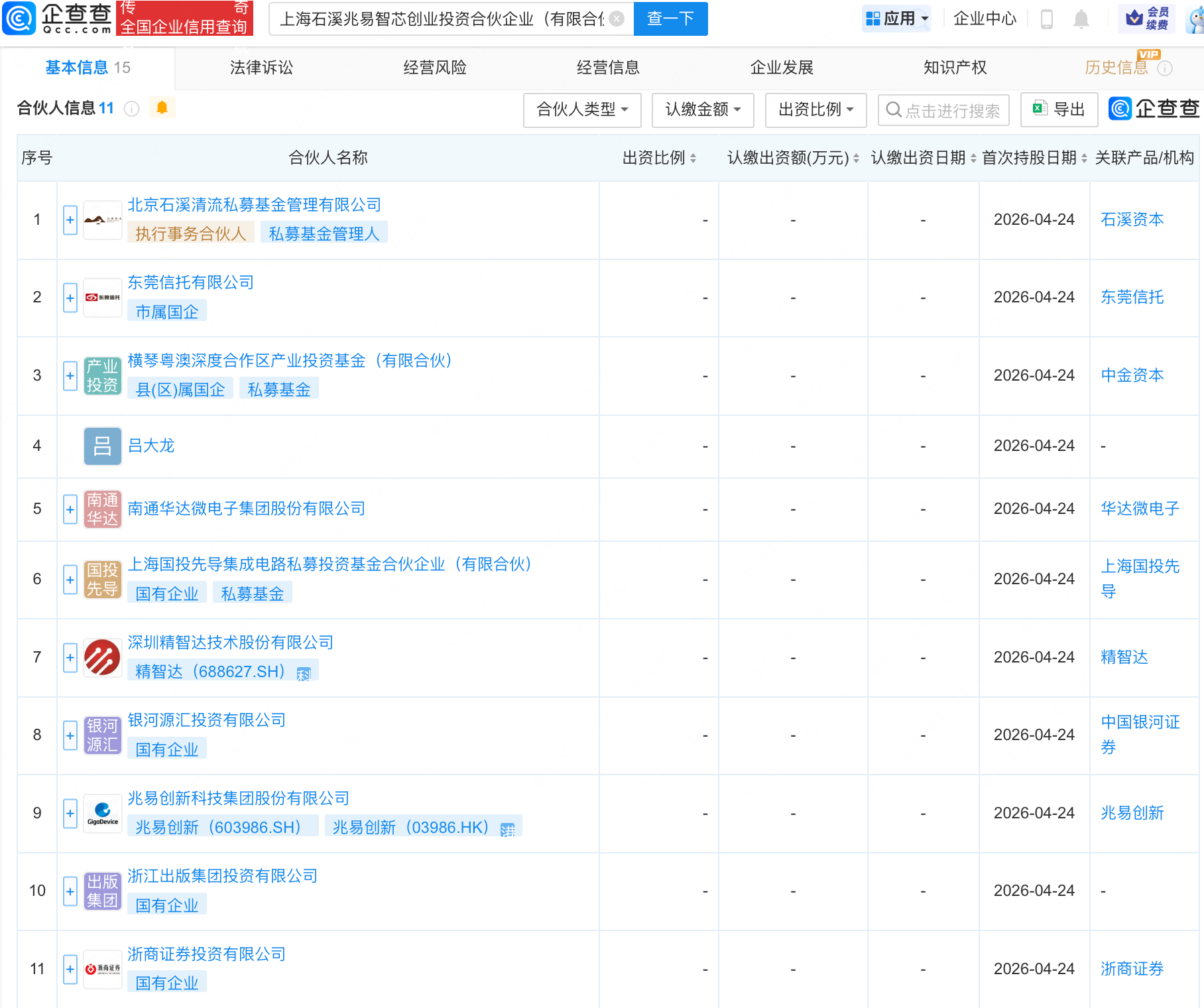 近日,上海石溪兆易智芯创业投资合伙企业(有限合伙)成立,出资额15.46亿元,经营范围包含:创业投资(限投资未上市企业)。企查查股权穿透显示,该企业由精智达(688627)、兆易创新(603986)等共同出资。