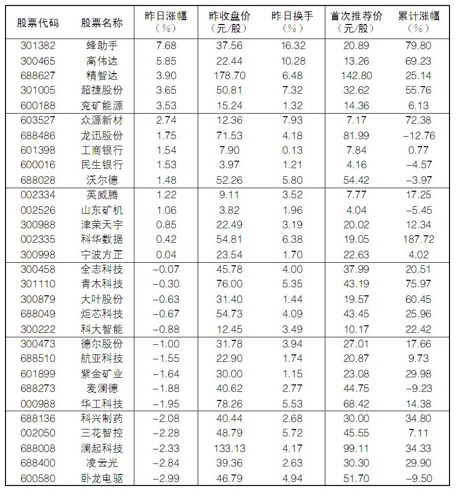 大众30指数成份股中,3日涨幅前五位的分别是蜂助手、高伟达、精智达、超捷股份、兖矿能源财富策略,涨幅分别为7.68%、5.85%、3.90%、3.65%、3.53%;跌幅榜上,卧龙电驱、凌云光、澜起科技等跌幅居前。